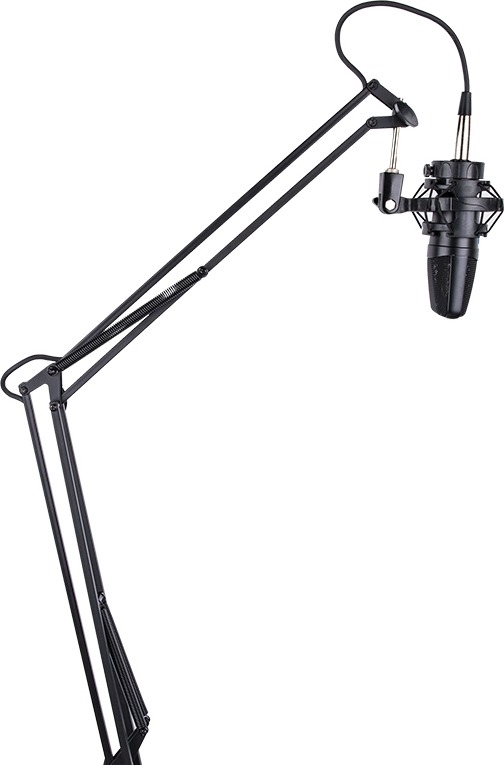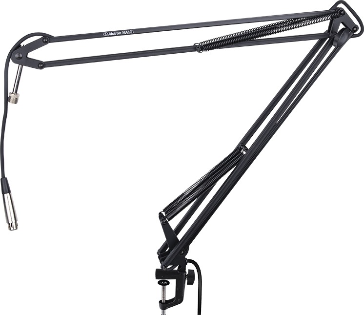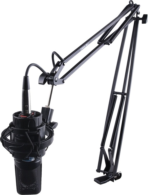 Fémből készült, asztali, karos mikrofonállvány, 5 méteres belső XLR mikrofonkábellel, elsősorban rádió/stúdió felhasználásra.