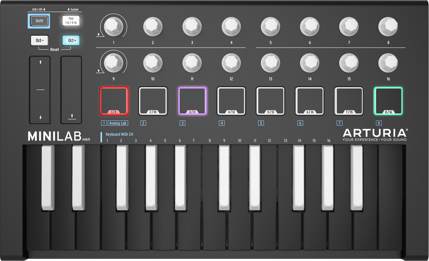 Az Arturia MiniLab MkIItökéletesen házasítja a hordozhatóságot, az átlátható kezelőfelületet, és a széles szoftveres hangszínparkot, 25 Slim-billentyűs, 16 enkóderes, és 8 dobpados kontroller az Analog Lab Lite szoftverszintetizátor 500 hangszínével, és Ableton Live Lite szoftverrel.