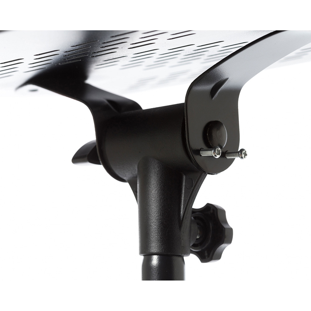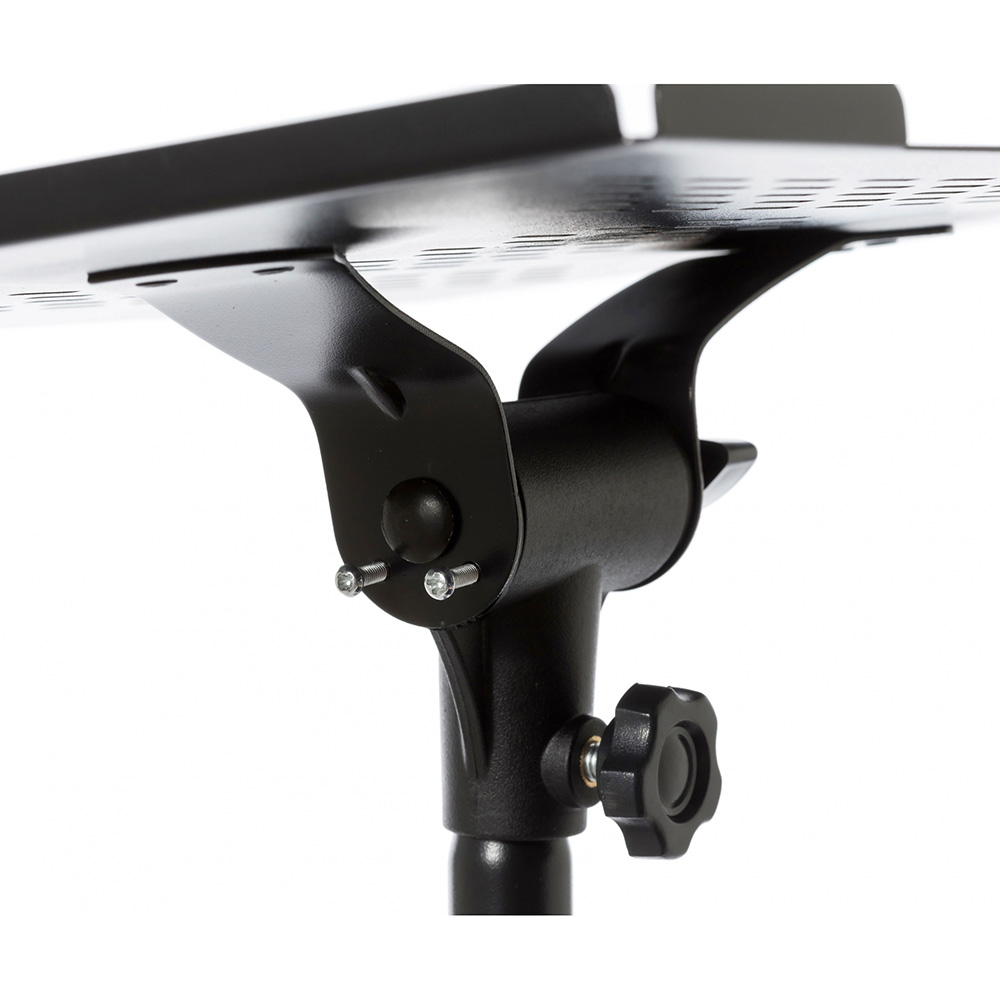 Laptop- / kivetítőállvány, acél kivitelben, állítható magassággal és dőlésszöggel. Az oldalán található, állítható tálca alkalmas egyéb eszközök elhelyezésére.