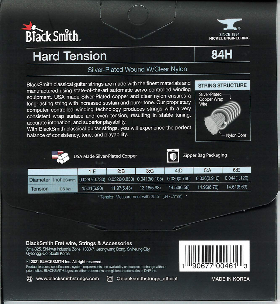 A 84H a Blacksmith bestseller klasszikus gitárhúr szettje, amely ideális egyensúlyt teremt a gazdag és meleg hangszín és a kényelmes játszhatóság között.