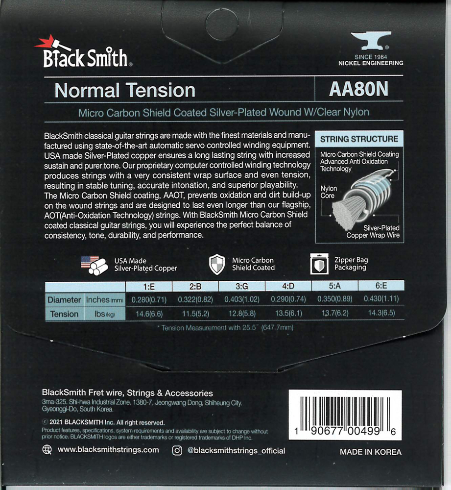 A BlackSmith klasszikus húrok a legkiválóbb alapanyagokból készülnek a legmodernebb tekercselő berendezés használatával. Az USA-ban gyártott ezüst bevonatos réz és tiszta nylon hosszú élettartamot és megnövelt hangkitartást biztosít. Számítógépvezérelt technológiával egyenletes tekercselést és húrnyomást kapunk, ami stabil hangolást, pontos intonációt és kiváló játszhatóságot eredményez.