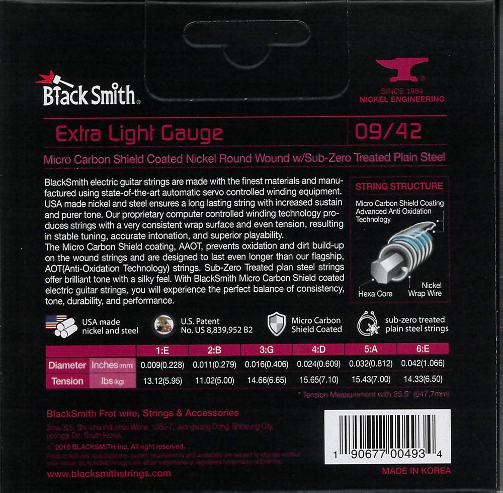 A BlackSmith elektromos gitár húrok a legkiválóbb alapanyagokból készülnek a legmodernebb tekercselő berendezés használatával. Az USA-ban gyártott nikkel és acél hosszú élettartamot és megnövelt hangkitartást biztosít. Számítógépvezérelt technológiával egyenletes tekercselést és húrnyomást kapunk, ami stabil hangolást, pontos intonációt és kiváló játszhatóságot eredményez.