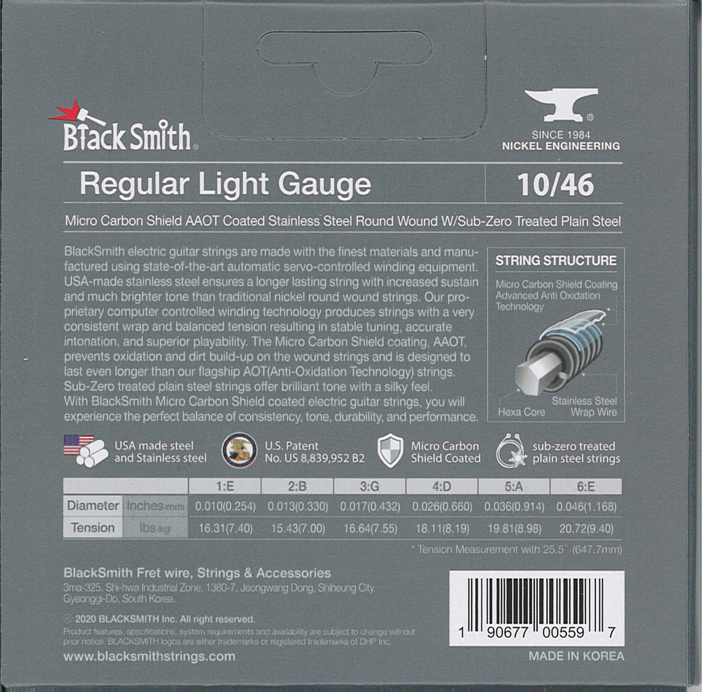 A BlackSmith elektromos gitár húrok a legkiválóbb alapanyagokból készülnek a legmodernebb tekercselő berendezés használatával. Az USA-ban gyártott rozsdamentes acél hosszabb élettartamot, jobb hangkitartást és tisztább hangzást kölcsönöz, mint a hagyományos nikkel tekercselésű húr. Számítógépvezérelt technológiával egyenletes tekercselést és húrnyomást kapunk, ami stabil hangolást, pontos intonációt és kiváló játszhatóságot eredményez.