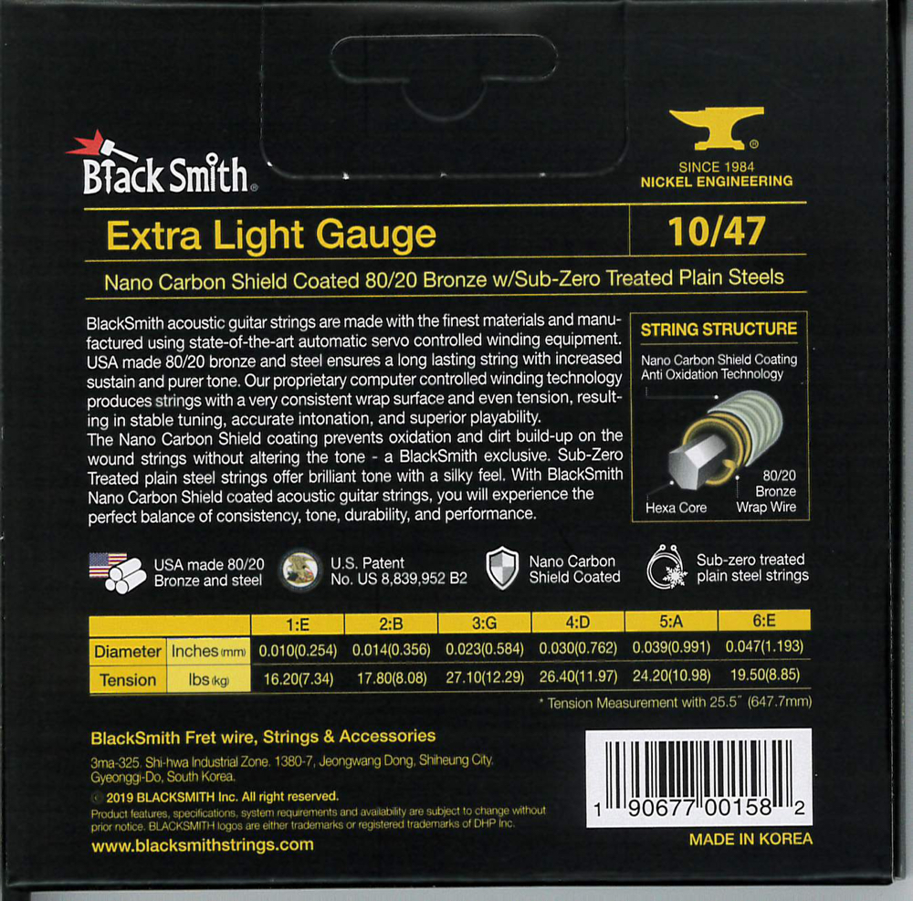 BlackSmith-exkluzív Nano Carbon Shield bevonattal rendelkezik, amely megakadályozza az oxidációt és a szennyeződések felhalmozódását anélkül, hogy a hangzást megváltoztatná. A fagyasztással kezelt acél húrok csilingelő hangzást és lágy tapintást adnak. Ez együttesen biztosítja a konzisztencia, a hangszín, a tartósság és a teljesítmény tökéletes egyensúlyát.