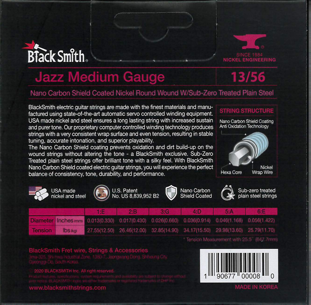 BlackSmith-exkluzív Nano Carbon Shield bevonattal rendelkezik, amely megakadályozza az oxidációt és a szennyeződések felhalmozódását anélkül, hogy a hangzást megváltoztatná. A fagyasztással kezelt acél húrok csilingelő hangzást és lágy tapintást adnak. Ez együttesen biztosítja a konzisztencia, a hangszín, a tartósság és a teljesítmény tökéletes egyensúlyát.