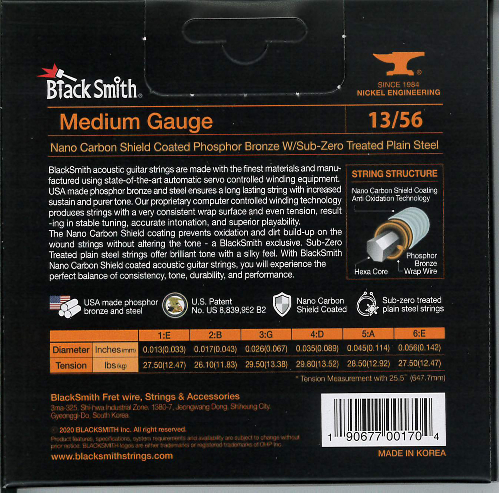 BlackSmith-exkluzív Nano Carbon Shield bevonattal rendelkezik, amely megakadályozza az oxidációt és a szennyeződések felhalmozódását anélkül, hogy a hangzást megváltoztatná. A fagyasztással kezelt acél húrok csilingelő hangzást és lágy tapintást adnak. Ez együttesen biztosítja a konzisztencia, a hangszín, a tartósság és a teljesítmény tökéletes egyensúlyát.
