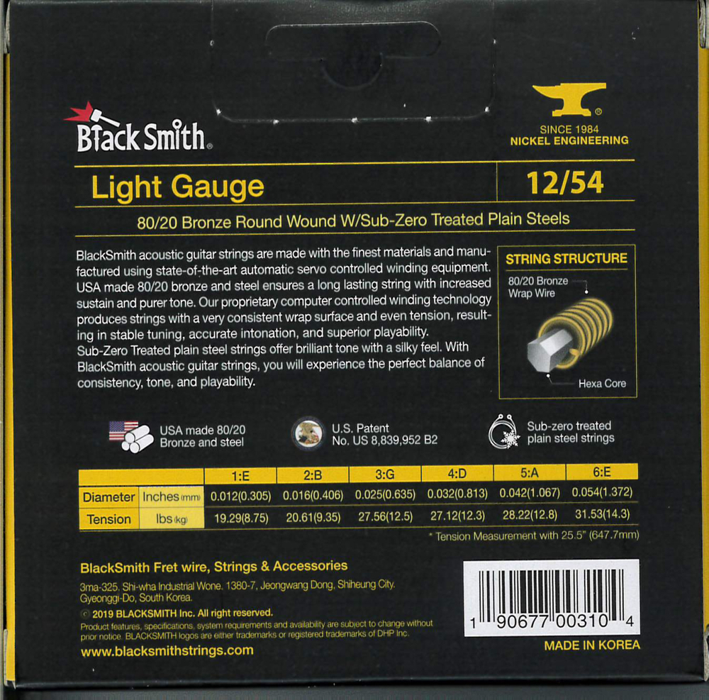 A BlackSmith akusztikus gitár húrok a legkiválóbb alapanyagokból készülnek a legmodernebb tekercselő berendezés használatával. Az USA-ban gyártott 80/20 bronz és acél hosszú élettartamot és megnövelt hangkitartást biztosít. Számítógépvezérelt technológiával egyenletes tekercselést és húrnyomást kapunk, ami stabil hangolást, pontos intonációt és kiváló játszhatóságot eredményez. A fagyasztással kezelt acél húrok csilingelő hangzást és lágy tapintást adnak. Ez együttesen biztosítja a konzisztencia, a hangszín, a tartósság és a teljesítmény tökéletes egyensúlyát.