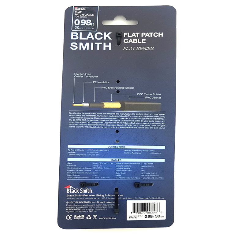 A BlackSmith lapos patch kábeleit a tiszta, zajmentes jeltovábbításra tervezték. A nikkel-króm bevonat a 6,35 mm-es jack csatlakozókon növeli a vezetőképességet és gátolja a korróziót. A 26 AWG OFC árnyékolás kiküszöböli az EMI (elektromágneses interferencia) és RFI (rádiófrekvenciás interferencia) hatását, így biztosítja a zajmentességet. A BlackSmith lapos patch kábelekkel helyet takaríthatunk meg a pedalboardon, miközben megőrizzük a tiszta, veszteségmentes hangot.