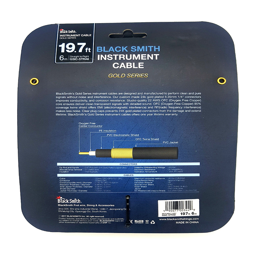 A BlackSmith Gold széria hangszerkábeleit a tiszta, zajmentes jeltovábbításra tervezték. A 24K arany bevonat a 6,35 mm-es sárgaréz jack csatlakozókon növeli a vezetőképességet és gátolja a korróziót. A stúdió minőségű 22 AWG OFC (Oxygen Free Copper - oxigénmentes réz) mag biztosítja a veszteség nélküli jeltovábbítást. A 95%-os OFC árnyékolás kiküszöböli az EMI (elektromágneses interferencia) és RFI (rádiófrekvenciás interferencia) hatását, így biztosítja a zajmentességet.