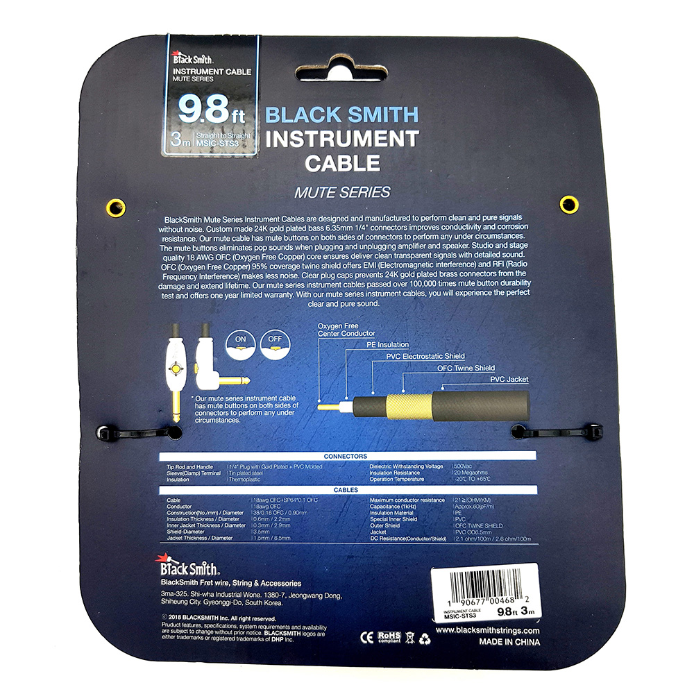 A BlackSmith Mute széria hangszerkábeleit a tiszta, zajmentes jeltovábbításra tervezték. A 24K arany bevonat a 6,35 mm-es sárgaréz jack csatlakozókon növeli a vezetőképességet és gátolja a korróziót. A Mute kábelek csatlakozói mute gombbal rendelkeznek, ami megszünteti a kattanó hangot az erősítő vagy hangfal csatlakoztatásakor. Ezek a gombok 100 000-szeres tartóssági teszten mentek keresztül. A színpadi és stúdió minőségű 22 AWG OFC (Oxygen Free Copper - oxigénmentes réz) mag biztosítja a veszteség nélküli jeltovábbítást. A 95%-os OFC árnyékolás kiküszöböli az EMI (elektromágneses interferencia) és RFI (rádiófrekvenciás interferencia) hatását, így biztosítja a zajmentességet.