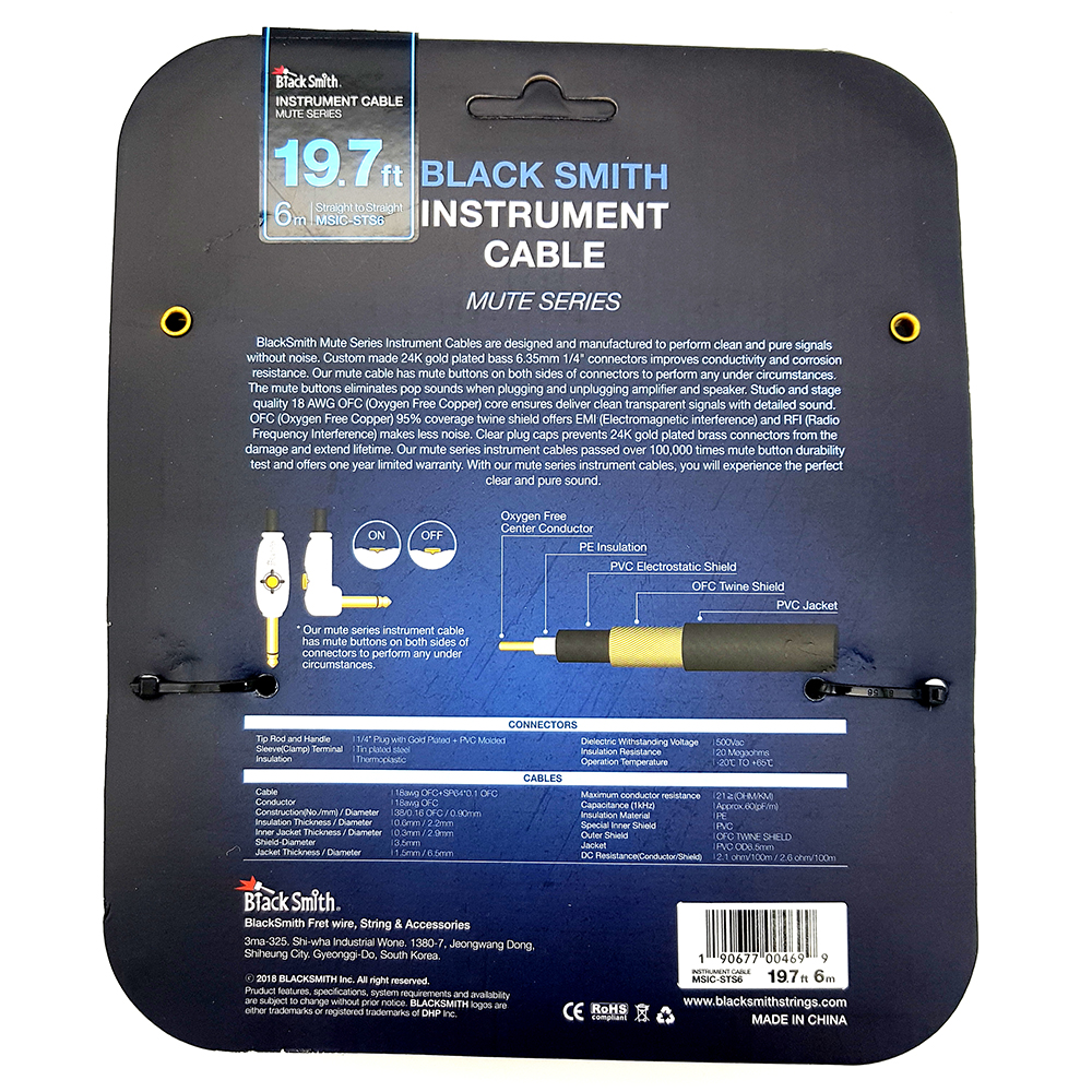 A BlackSmith Mute széria hangszerkábeleit a tiszta, zajmentes jeltovábbításra tervezték. A 24K arany bevonat a 6,35 mm-es sárgaréz jack csatlakozókon növeli a vezetőképességet és gátolja a korróziót. A Mute kábelek csatlakozói mute gombbal rendelkeznek, ami megszünteti a kattanó hangot az erősítő vagy hangfal csatlakoztatásakor. Ezek a gombok 100 000-szeres tartóssági teszten mentek keresztül. A színpadi és stúdió minőségű 22 AWG OFC (Oxygen Free Copper - oxigénmentes réz) mag biztosítja a veszteség nélküli jeltovábbítást. A 95%-os OFC árnyékolás kiküszöböli az EMI (elektromágneses interferencia) és RFI (rádiófrekvenciás interferencia) hatását, így biztosítja a zajmentességet.