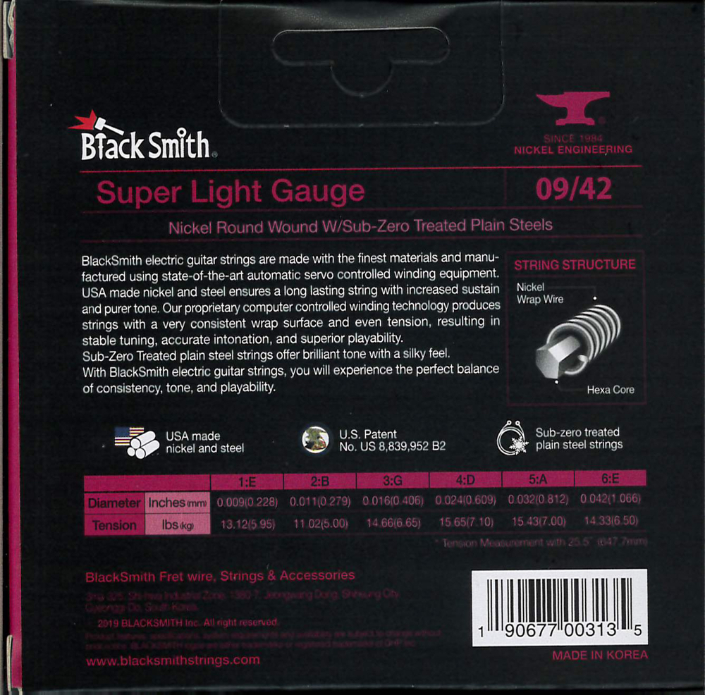 A BlackSmith elektromos gitár húrok a legkiválóbb alapanyagokból készülnek a legmodernebb tekercselő berendezés használatával. Az USA-ban gyártott nikkel és acél hosszú élettartamot és megnövelt hangkitartást biztosít. Számítógépvezérelt technológiával egyenletes tekercselést és húrnyomást kapunk, ami stabil hangolást, pontos intonációt és kiváló játszhatóságot eredményez. A fagyasztással kezelt acél húrok csilingelő hangzást és lágy tapintást adnak.