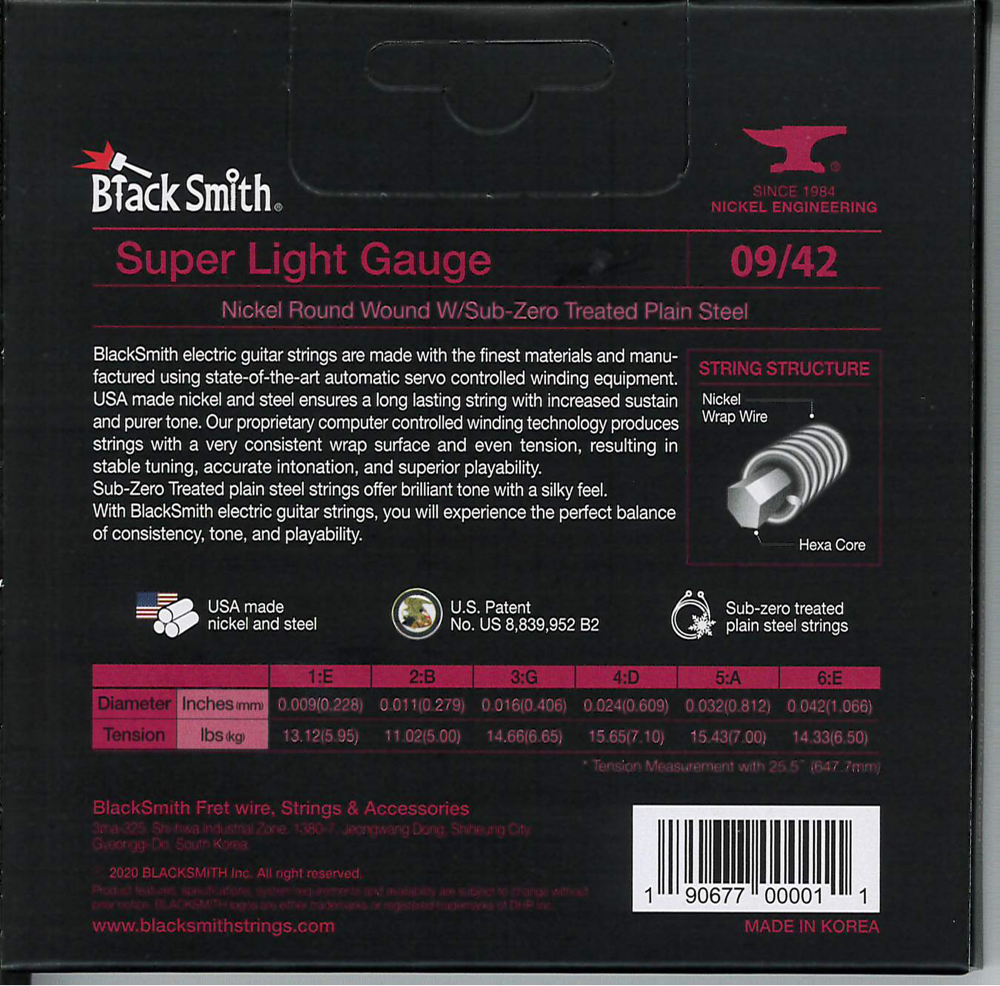 A BlackSmith elektromos gitár húrok a legkiválóbb alapanyagokból készülnek a legmodernebb tekercselő berendezés használatával. Az USA-ban gyártott nikkel és acél hosszú élettartamot és megnövelt hangkitartást biztosít. Számítógépvezérelt technológiával egyenletes tekercselést és húrnyomást kapunk, ami stabil hangolást, pontos intonációt és kiváló játszhatóságot eredményez. A fagyasztással kezelt acél húrok csilingelő hangzást és lágy tapintást adnak.