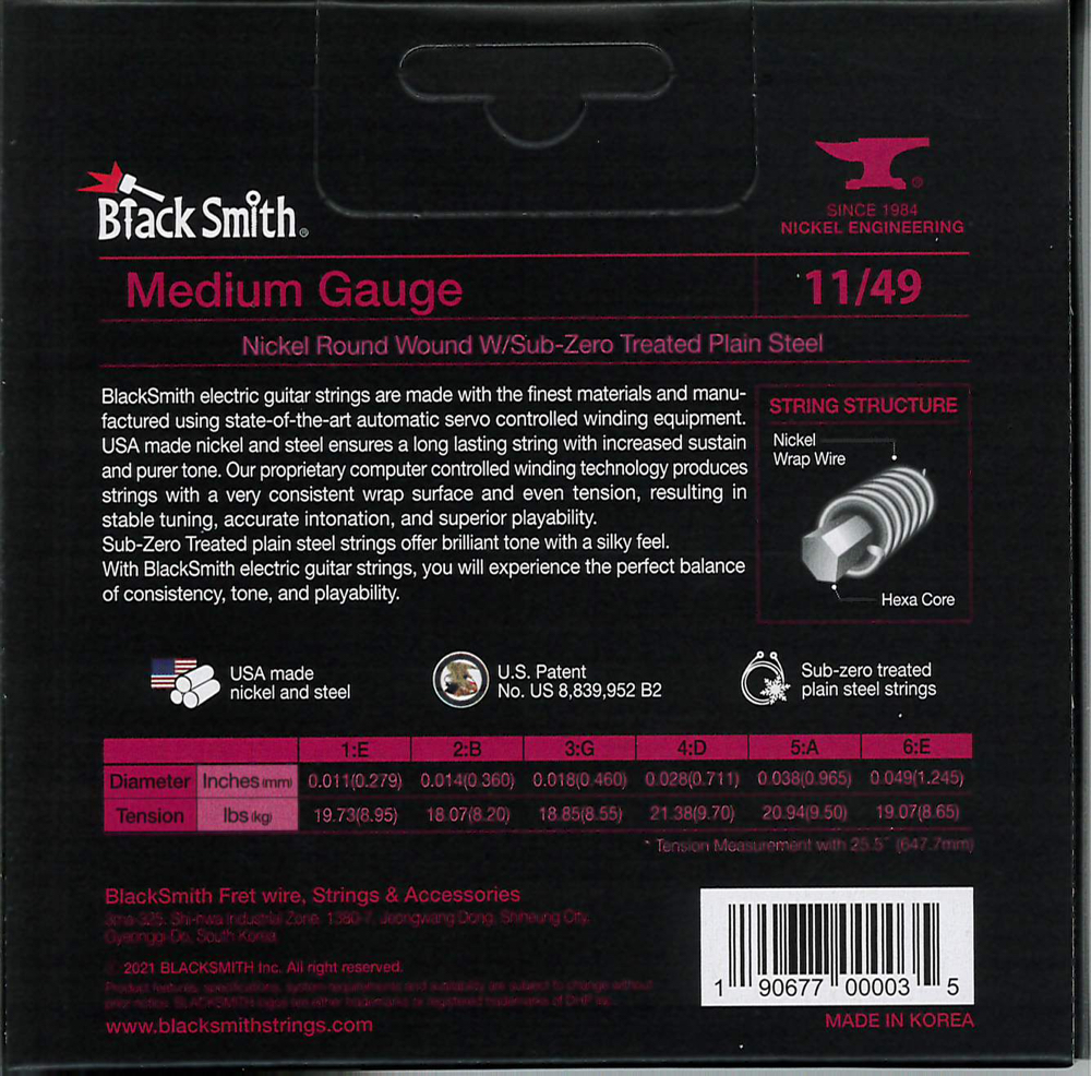 A BlackSmith elektromos gitár húrok a legkiválóbb alapanyagokból készülnek a legmodernebb tekercselő berendezés használatával. Az USA-ban gyártott nikkel és acél hosszú élettartamot és megnövelt hangkitartást biztosít. Számítógépvezérelt technológiával egyenletes tekercselést és húrnyomást kapunk, ami stabil hangolást, pontos intonációt és kiváló játszhatóságot eredményez. A fagyasztással kezelt acél húrok csilingelő hangzást és lágy tapintást adnak.