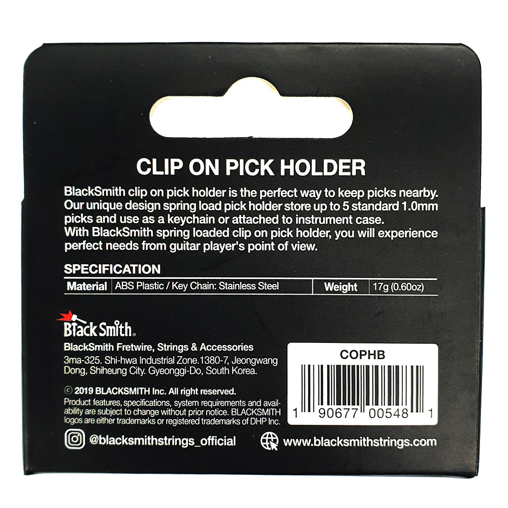 A BlackSmith felcsíptethető pengetőtartó rugós tárolórendszerrel rendelkezik, és 5 standard 1,0 mm-es pengető fér bele. Hangszerre csíptethető vagy a tartozék lánccal kulcstartóként használható vagy hangszertokra rögzíthető.
