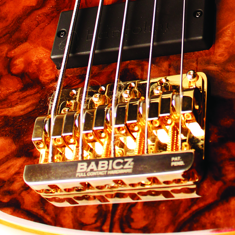 Az éger test különleges, egzotikus dió fedlappal, egy pár Bartolini Jeff Berlin custom soapbar hangszedővel, Babicz Full Contact Hardware híddal és passzív elektronikával szerelték fel. Az kemény juhar nyakot szépen kiegészíti az ébenfa fogólap és a fejen elhelyezkedő Hipshot Ultralite kulcsok. A DR Strings Custom DDT (Drop Down Tuning) húrok könnyű játszhatóságot tesznek lehetővé.