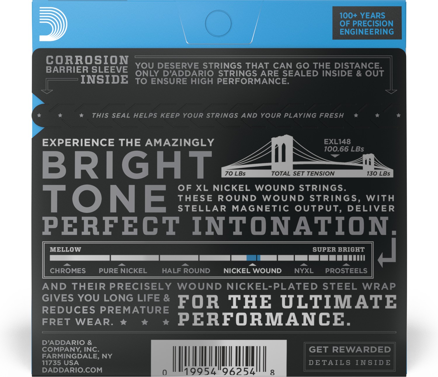 - XL Nickel Round Wound széria, nikkelezett palást, körhuzallal csavart húrok, acél mag