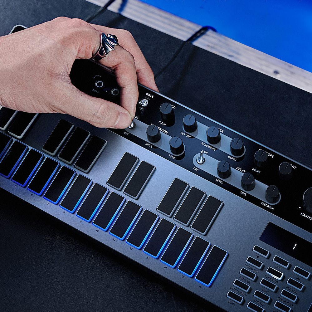 - Könnyen használható 16 lépéses sequencer 128 felhasználói mintával
