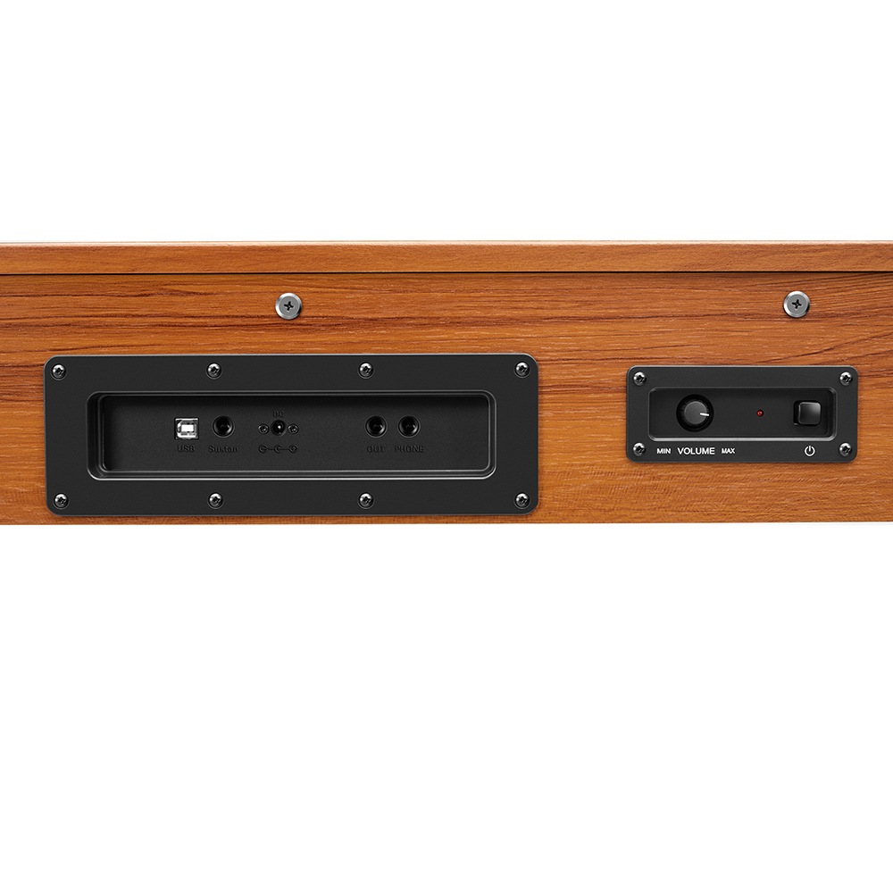 - Csatlakozók: AUX OUT, USB-B, Pedál, Power, Fejhallgató