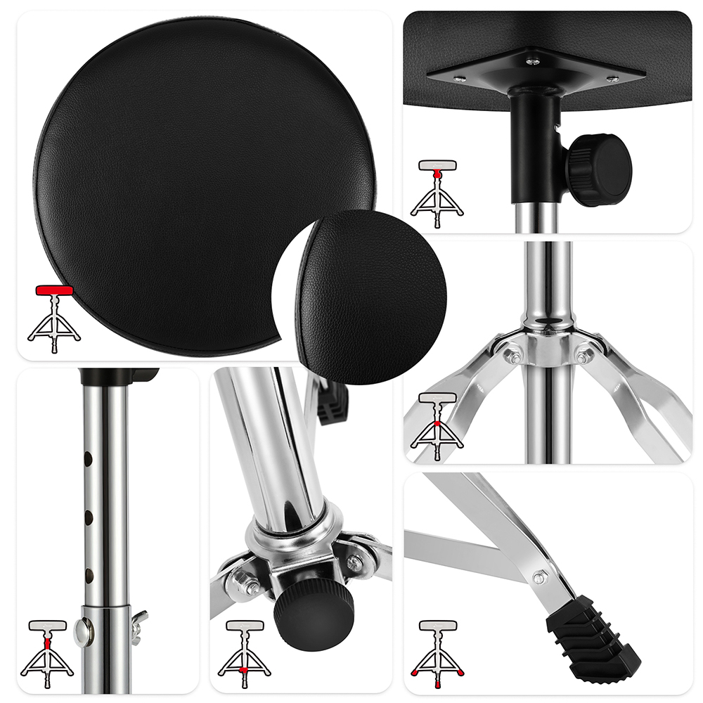 [Csúszásmentes kialakítás] A dobszék három csúszásmentes gumiborítással rendelkezik, amelyek megakadályozzák, hogy elmozduljon játék közben. A kiváló minőségű alumíniumötvözetből készült, háromszög alakú konzol biztosítja a stabilitást.