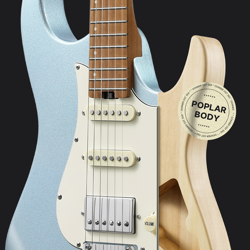 7-hangszín választó rendszer ThunderForge hangszedőkkel: Egy független kapcsolóval könnyen elérhetők a 7 hangszín opció. Egytekercses módban klasszikus hangzást biztosít kivételes tisztasággal. A DST-550 DONNER ThunderForge hangszedőivel rendelkezik, kapcsolható humbuckerrel és két single coil-lal. Tartalmaz egy kétpontos locking tremolót is, amely sokoldalú játékot tesz lehetővé, könnyed átmenettel a klasszikus, blues hangzástól a modern high-gain hangzásig.