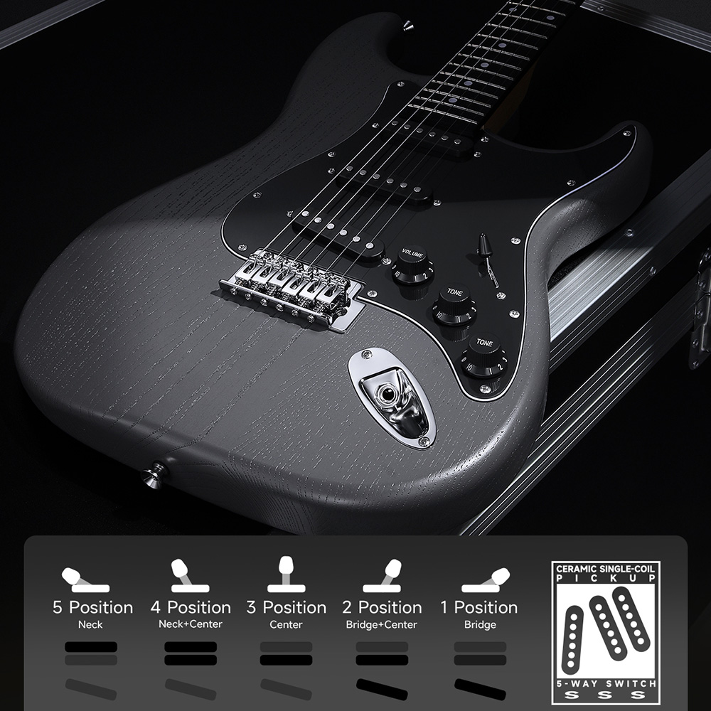Tartozékok: 5 wattos erősítő, capo, húr, heveder, gitártok, imbuszkulcs, tremoló kar