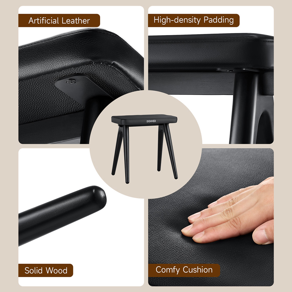 A kiváló minőségű tömör fából készült DKB-100 zongoraszék egyedi, gradiens kerek lábszerkezete nemcsak az általános esztétikát emeli ki, hanem hatékonyan oszlatja el a súlyt és növeli a szék stabilitását.