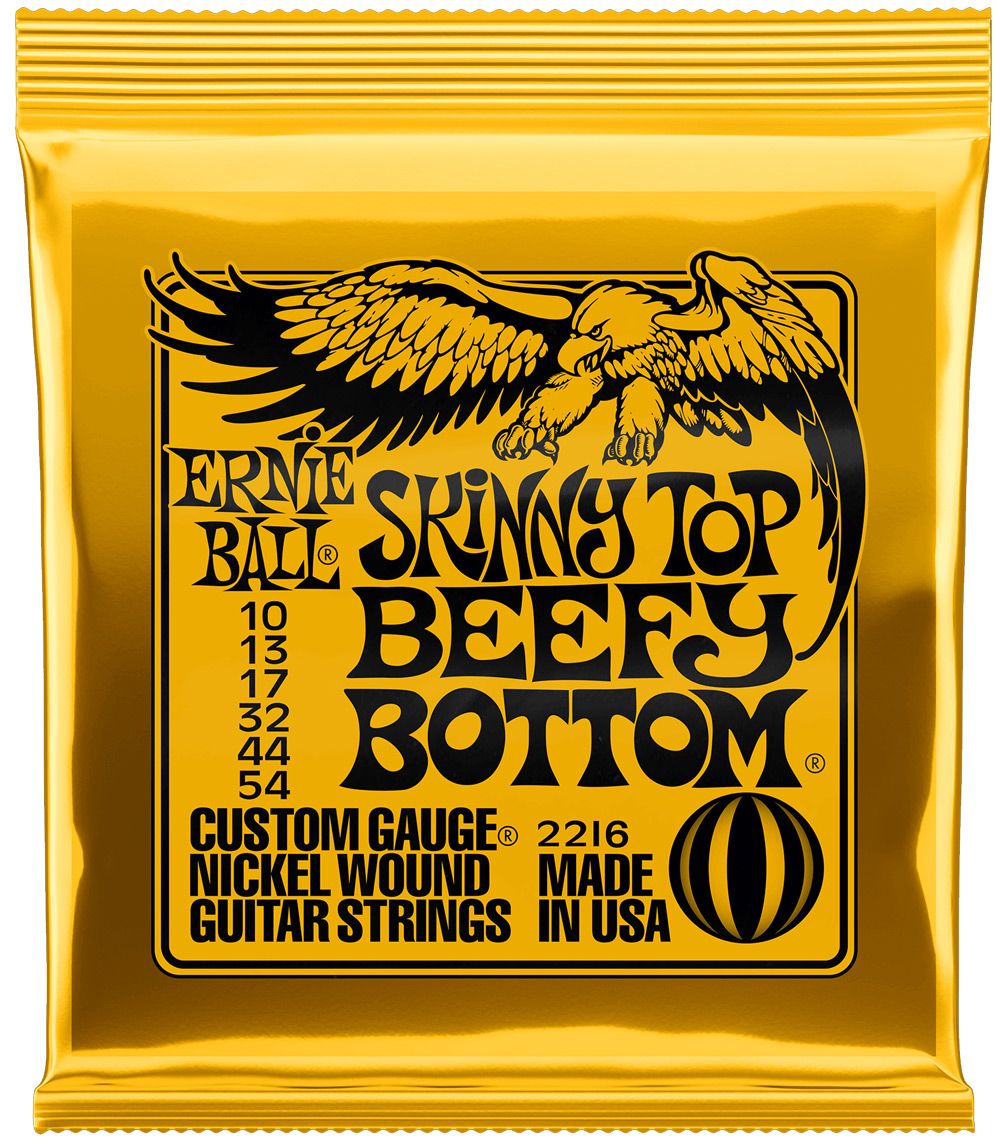 Az Ernie Ball Skinny Top Beefy Bottom húrok a Regular Slinky könnyebb játszhatóságát kombinálják a Beefy Slinkynél kicsit markánsabb vastagságú sodrott húrokkal. Ez a kombináció a legjobb választás azoknak a zenészeknek akik imádják a gyönyörű nyújtott szólókat miközben a riffeknél élvezhetik a vastagabb tónust.