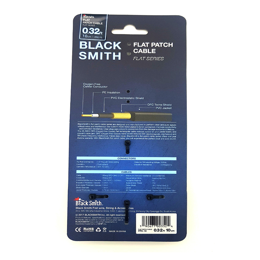 A BlackSmith lapos patch kábeleit a tiszta, zajmentes jeltovábbításra tervezték. A nikkel-króm bevonat a 6,35 mm-es jack csatlakozókon növeli a vezetőképességet és gátolja a korróziót. A 26 AWG OFC árnyékolás kiküszöböli az EMI (elektromágneses interferencia) és RFI (rádiófrekvenciás interferencia) hatását, így biztosítja a zajmentességet. A BlackSmith lapos patch kábelekkel helyet takaríthatunk meg a pedalboardon, miközben megőrizzük a tiszta, veszteségmentes hangot.