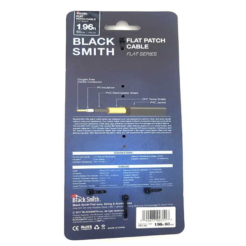 A BlackSmith lapos patch kábeleit a tiszta, zajmentes jeltovábbításra tervezték. A nikkel-króm bevonat a 6,35 mm-es jack csatlakozókon növeli a vezetőképességet és gátolja a korróziót. A 26 AWG OFC árnyékolás kiküszöböli az EMI (elektromágneses interferencia) és RFI (rádiófrekvenciás interferencia) hatását, így biztosítja a zajmentességet. A BlackSmith lapos patch kábelekkel helyet takaríthatunk meg a pedalboardon, miközben megőrizzük a tiszta, veszteségmentes hangot.