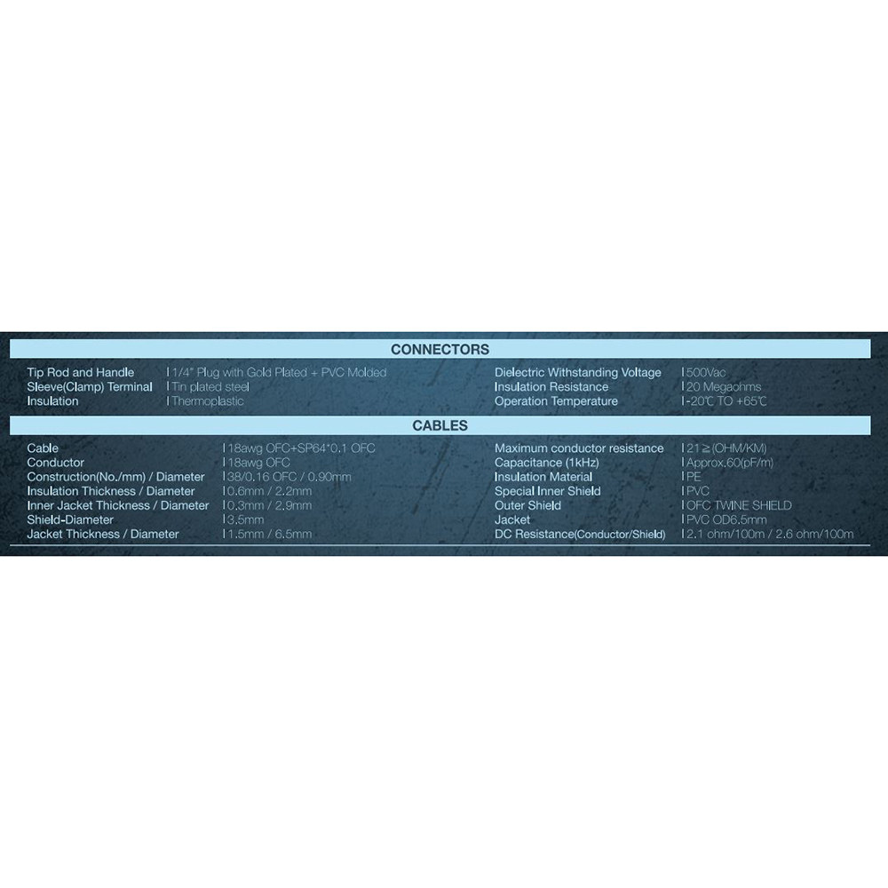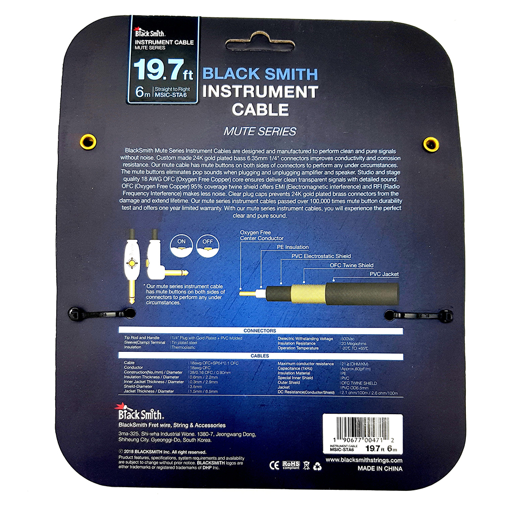 A BlackSmith Mute széria hangszerkábeleit a tiszta, zajmentes jeltovábbításra tervezték. A 24K arany bevonat a 6,35 mm-es sárgaréz jack csatlakozókon növeli a vezetőképességet és gátolja a korróziót. A Mute kábelek csatlakozói mute gombbal rendelkeznek, ami megszünteti a kattanó hangot az erősítő vagy hangfal csatlakoztatásakor. Ezek a gombok 100 000-szeres tartóssági teszten mentek keresztül. A színpadi és stúdió minőségű 22 AWG OFC (Oxygen Free Copper - oxigénmentes réz) mag biztosítja a veszteség nélküli jeltovábbítást. A 95%-os OFC árnyékolás kiküszöböli az EMI (elektromágneses interferencia) és RFI (rádiófrekvenciás interferencia) hatását, így biztosítja a zajmentességet.