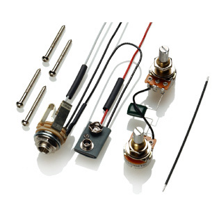Tartozékok: EMG Quik-Connect kábel, csavarok és rugók, hangerő és hangszín potméter, 9V-os elem és jackdugó aljzat
