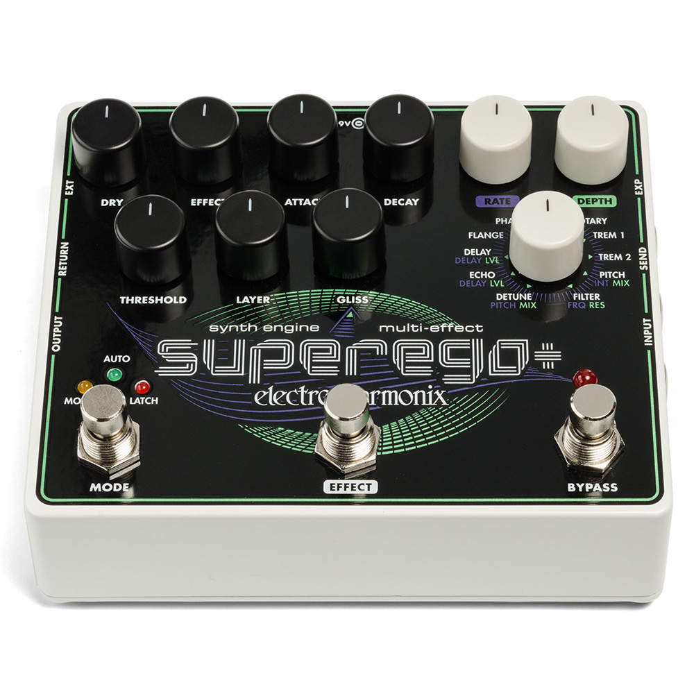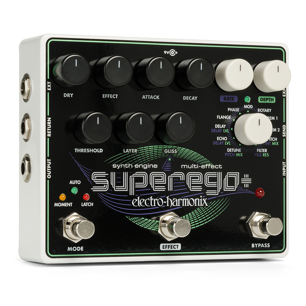 Building on the synthesis platform of the award-winning Superego, our new Superego+ raises the bar when it comes to creating synth effects, sound layers, glissandos, infinite sustain and more. Plus, we’ve added a complete effects section featuring 11 effects types, an EXP input for effect parameter control/preset recall and an EXT jack for a 3-button controller.
