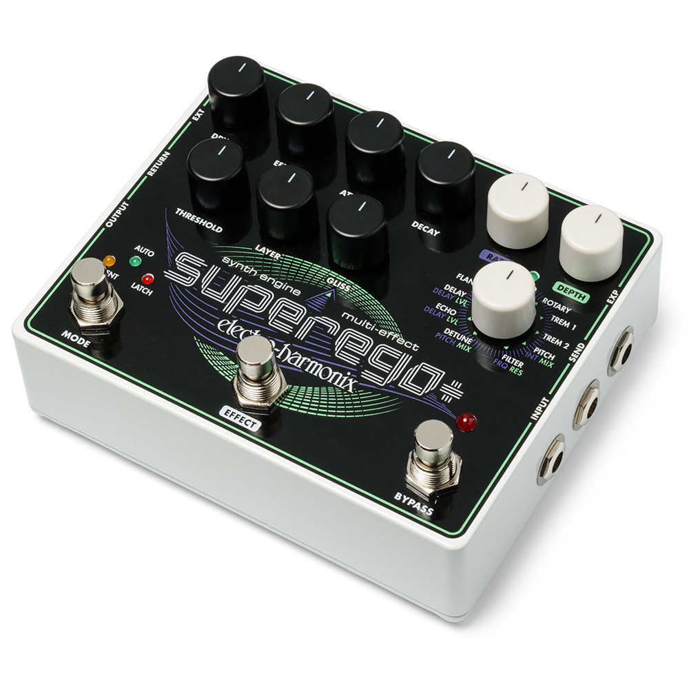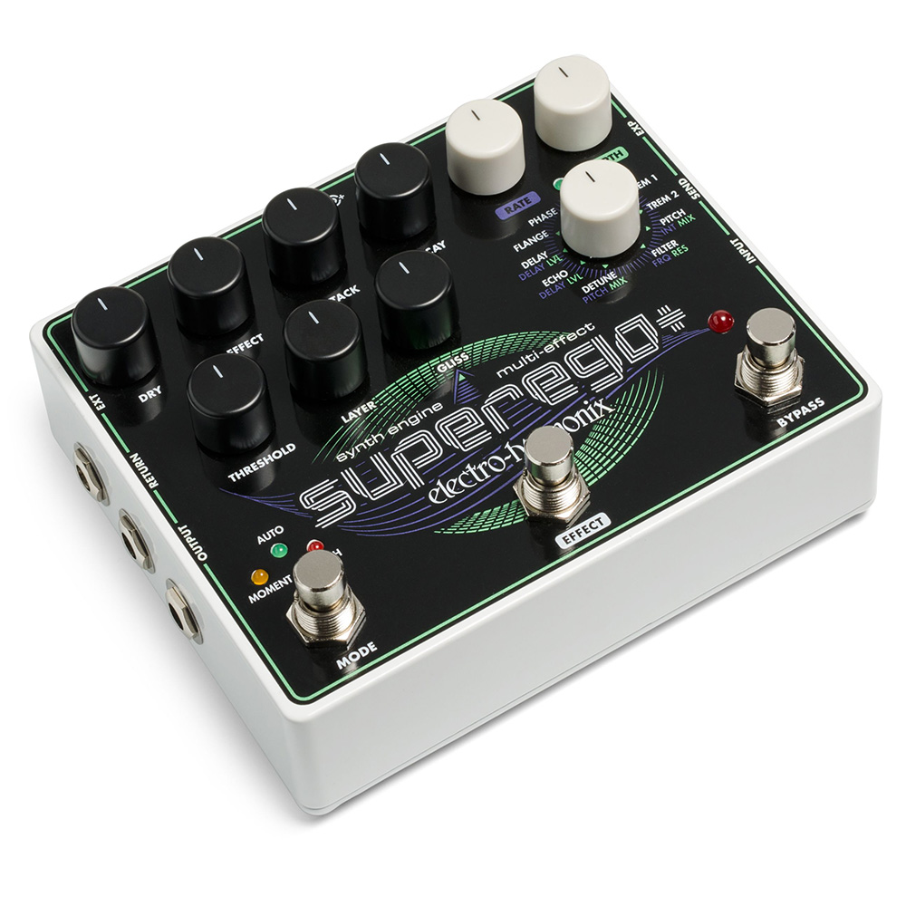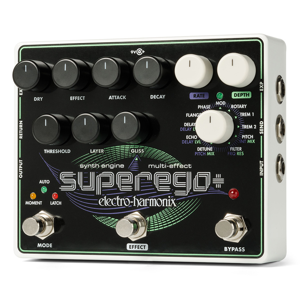 The polyphonic Superego+ works with guitar as well as other instruments including bass, keyboards, vocals, drums, etc. and comes equipped with an EHX 9.6DC-200 AC Adaptor.
