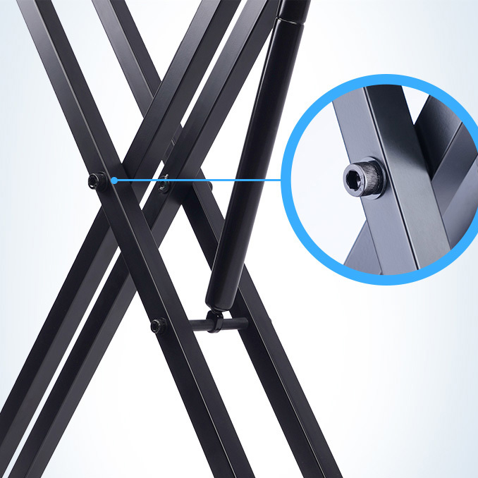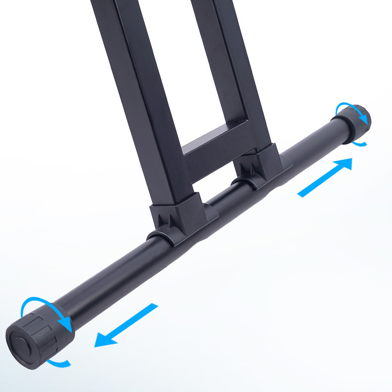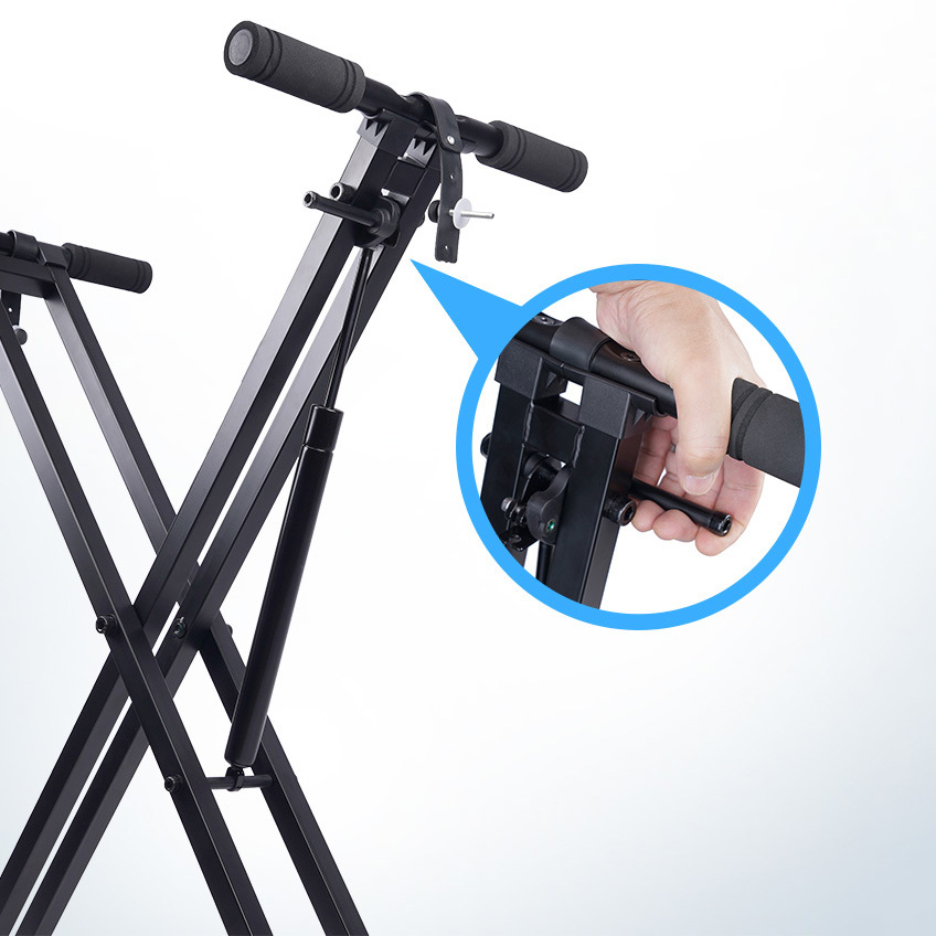 Gázrugóval állítható magasság: A gázrugó befelé húzásával összecsukható, kifelé tolásával pedig nyitható az állvány, így könnyedén beállítható a kívánt magasság, akár akkor is, amikor már rajta van a billentyű.