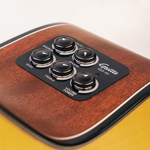 A GGP-02 a GUITTO legújabb pickup modellje. Különböző effektekkel rendelkezik (REVERB/CHORUS/DELAY), amelyeket erősítőhöz való csatlakoztatás nélkül is produkál.