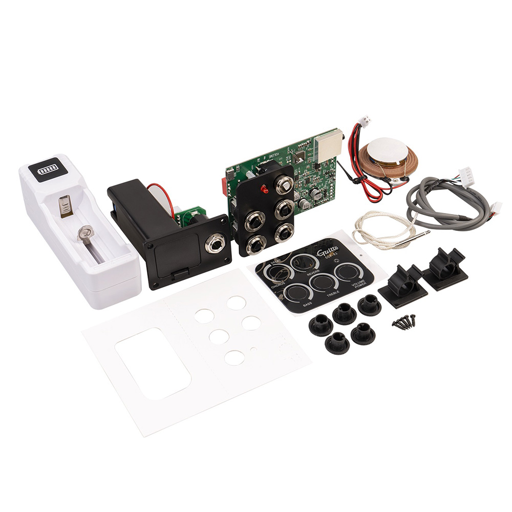 A csomag tartalmaz: áramköri lapok, elemtartó, piezo hangszedő, vibrációs egység, kábelcsipesz, 18650 Li akkumulátor, ragasztó, akku töltő.
