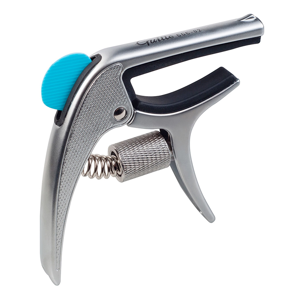 Fém kápó, ezüst színben. A \"revolver\" alakú capóval a húrra gyakorolt nyomás dinamikáját precízen állíthatod a tekerőrugóval, így a capo optimális rugalmassággal fogja a húrokat. Egyedi, gumírozott pengetőtartóval rendelkezik.