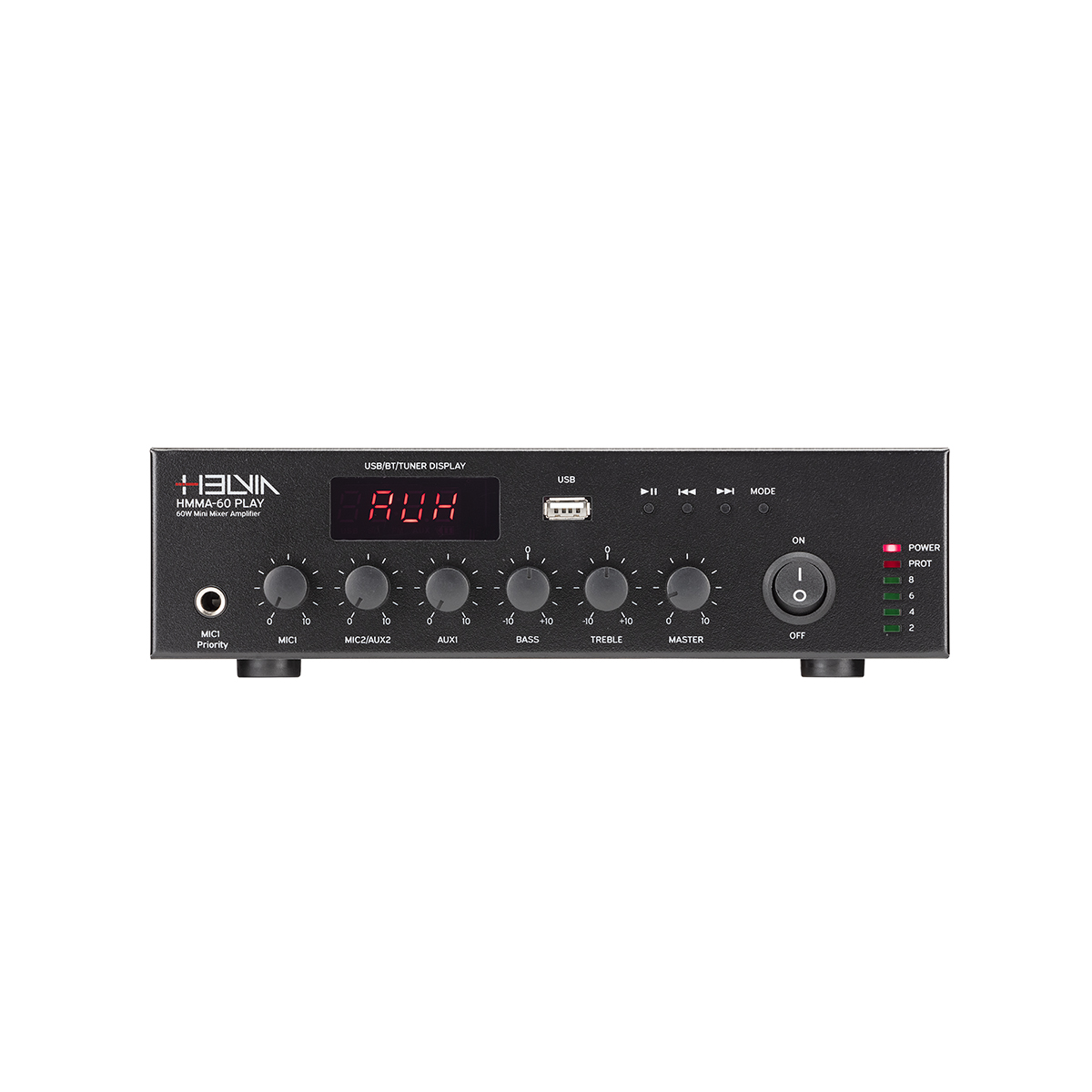 - HMMA PLAY series is designed for all those PA applications where space is quite zero. In half 19" Rack Unit there is a Class-D amplifier with powers ranging from 35W to 120W (70-100V or 4-16ohm outputs), a USB/BT/FM Radio with Remote Control, and a mixer for the control of the individual audio sources and the master. It is also possible to connect these amplifiers to your alarm system and power a 24V in the event of a fire prevention system. Really the perfect solution for small business premises.