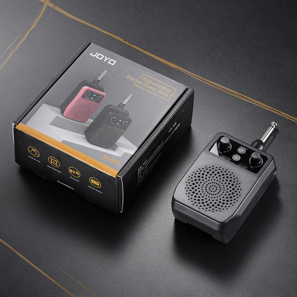 JOYO JA-05G: plug-and-play elektromos gitárerősítő. 6,35 mm-es jackkel tökéletes elektromos gitárokhoz: 4 beépített effekttel (CLEAN, OVERDRIVE, DISTORTION, REVERB), valamint Bluetooth kapcsolattal és hangszínszabályzóval rendelkezik.