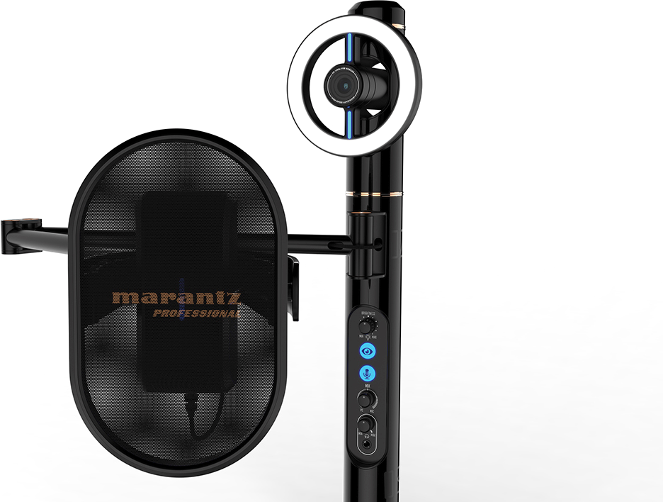 Az oszlopon találjuk a fő szabályzókat, amiket a streamer/podcaster könnyen elér a rendszer használata közben. Ezek között van egy LED fényerőszabályzó dimmer, ami bal szélső állásban kikapcsolja a fényforrást, fejhallgató kimeneti csatlakozó, az ehhez tartozó hangerőszabályzó, mikrofon érzékenység szabályzó, mikrofon némítás gomb, kamera ki- és bekapcsoló gomb.