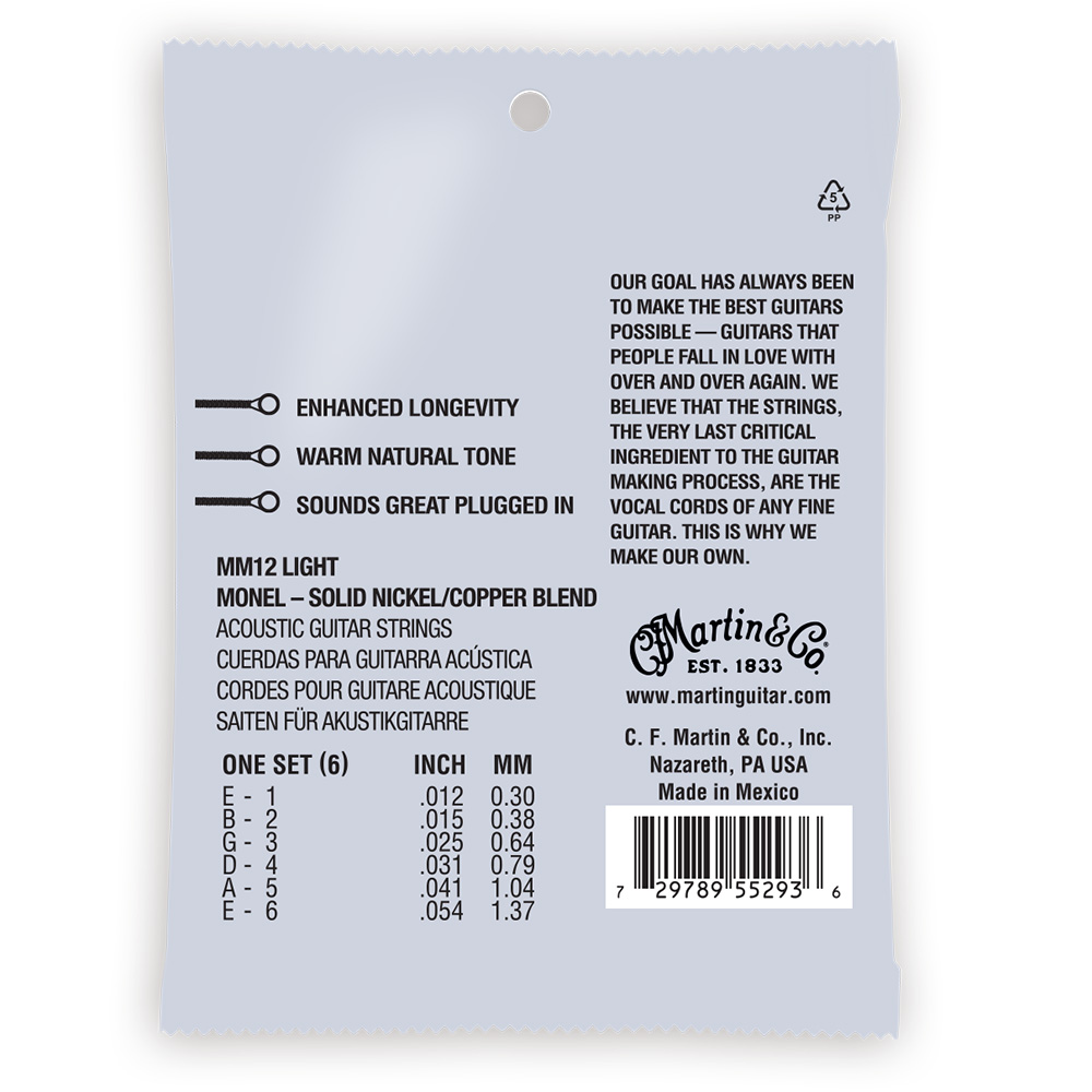 Martin® Retro® akusztikus gitárhúrok kialakítása megegyezik a bronz húrok előtti időszakban gyártott, nikkel alapú ötvözetből készült akusztikus húrokéval, melynek meleg, lágy és a hangszer hangját jobban érvényesítő tulajdonságai vannak. A monel ötvözet (2/3 nikkel, 1/3 réz) egy nagyon korrózióálló tartós anyag, lágy, igazi vintage hangzással.