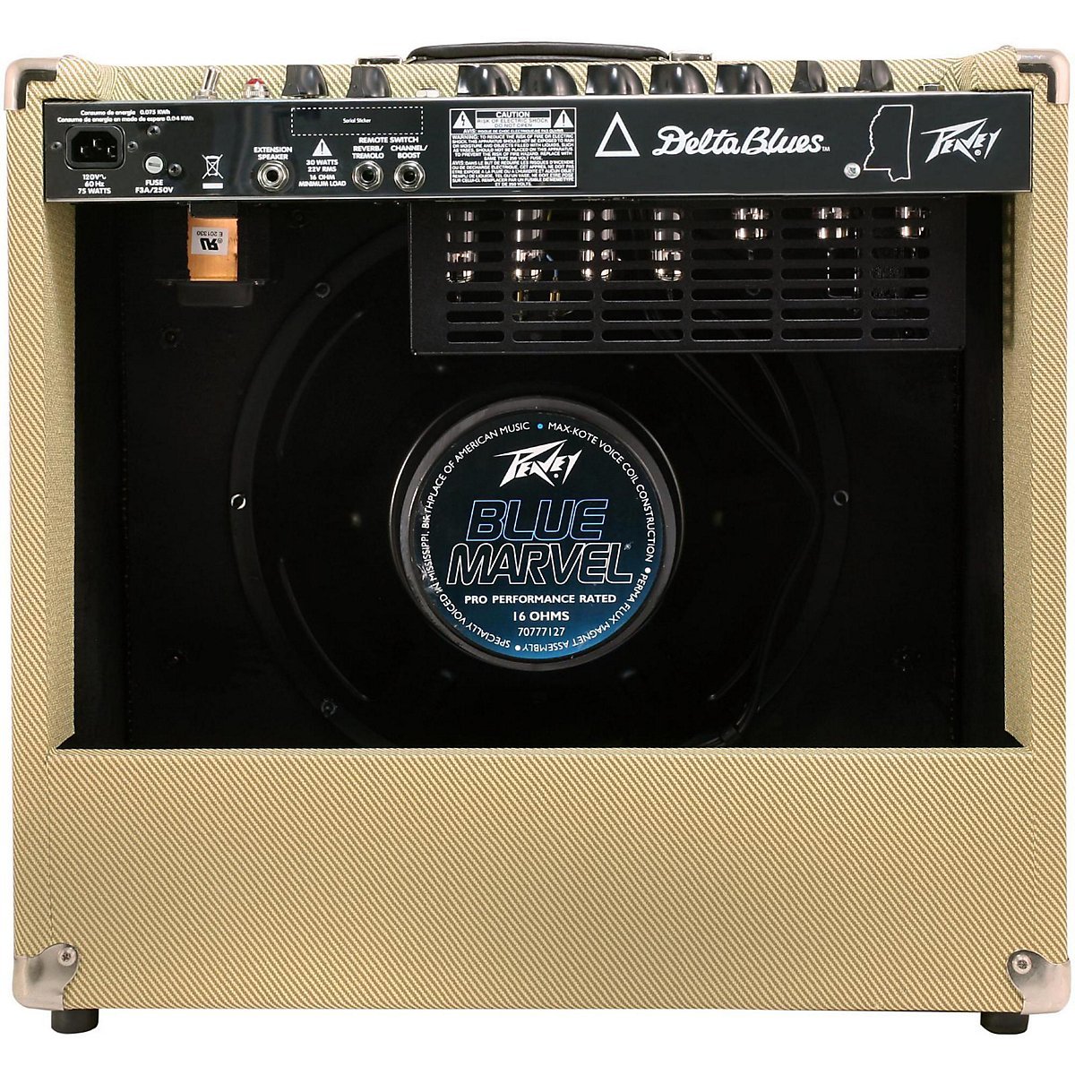 Peavey Delta Blues 115, 30 watt-os csöves gitárkombó. Újítás - Standby kapcsoló, 2. lábkapcsoló bemenet, zajtalan kapcsolók, trafó, cső aljzatok, kihúzható tápkábel, könnyen hozzáférhető csövek és biztosíték.