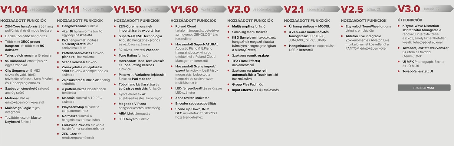 A FANTOM folyamatosan fejlődik, hozzáadott új hangszínekkel és funkciókkal. Az időről-időre megjelenő frissítésekkel a felhasználók kívánságai teljesülnek, a Roland Cloud-on keresztül elérhető több tucat Sound Pack és Wave Expansion hangszíngyűjteménnyel pedig mindig naprakészen tartható a FANTOM hangzása.