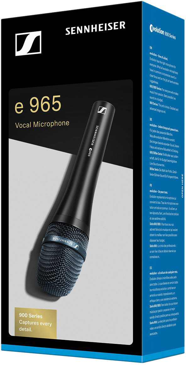 Az e 965 a csúcsminőségű stúdió- és színpadi mikrofonok előnyös tulajdonságainak tökéletes kombinációja: nagyfelbontású, sokszínű hangzás, melyhez kiváló gerjedésgátlás és rendkívül masszív konstrukció társul. Az evolution sorozat zászlóshajója egy nagymembrános, valódi kondenzátor mikrofon, melyet professzionális színpadi használatra terveztek. Kiegyensúlyozott hangzását tisztaság és kifinomultság jellemzi; selymesen csillogó magas-tartomány és meleg, jól körülhatárolt mélyközép-tartomány jellemzi. Az e 965 rendkívül rövid válaszidővel rendelkezik, és még a legfinomabb részleteket is lenyűgöző részletezettséggel adja vissza. A színpadi elrendezéstől függően az iránykarakterisztika az enyhe kardioid és a közvetlenebb szuper-kardioid között kapcsolható. Ez a csúcsmodell a hangzás, a tartósság és a kezelhetőség tekintetében nem ismer lehetetlent.