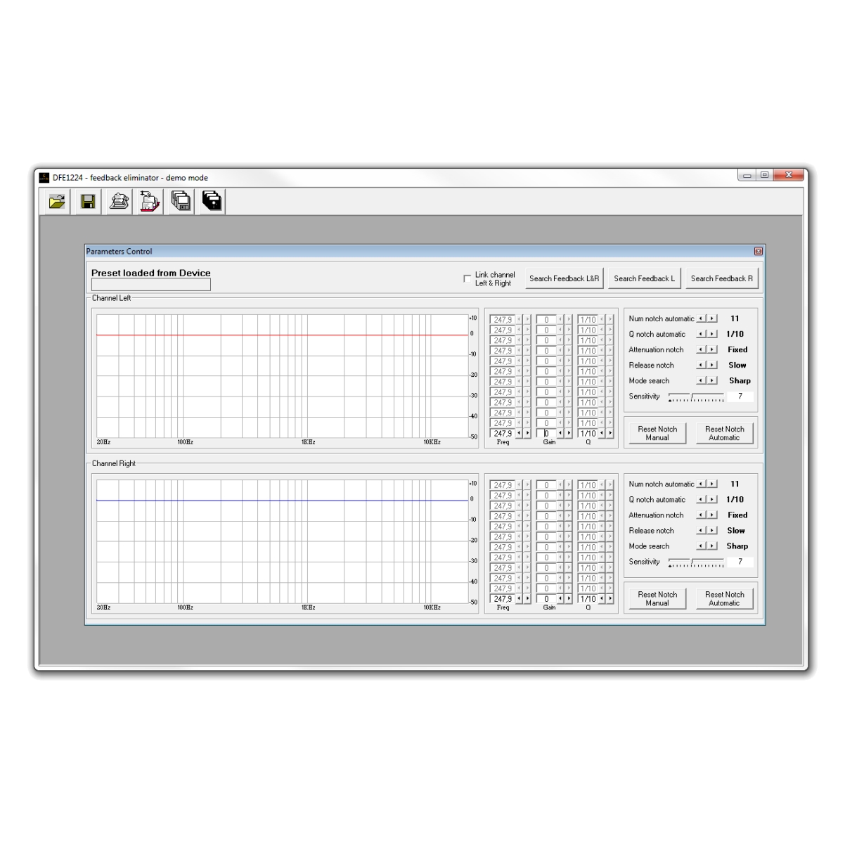 - A DFE-1224 egy visszacsatolás érzékelő eszköz, amely két csatornás vagy mono módban használható. A visszacsatoló rendszer megvizsgálja a jelút összes frekvenciáját, meghatározza a Larsen-effektus okát és törli azt a 12 valós idejű nagy pontosságú bevágási szűrő megvalósításával, amelyek - 45dB csillapításúak. A rendszer 15 lépésben állítható be, így a felhasználó megváltoztathatja a DFE-1224 hangvisszajelzéssel szembeni érzékenységét az helyzetének igényei szerint. A 12 csatornánkénti szűrő paramétereinek beállításai a RAM memóriában maradnak, de ha ezeket későbbi referencia beállításként meg kell őrizni, akkor azokat a felhasználói memória előre beállított értékébe kell menteni. Ha a módosított beállításokat a memóriába mentése előtt kikapcsolja a DFE-1224-et, akkor ezek elvesznek, és a készülék bekapcsolásakor az utoljára mentett memóriabeállítások lesznek alapértelmezettek. Az egységnek 20 memória áll rendelkezésre, 4 gyári és 16 felhasználói memória segítségével. A DFE-1224 rendelkezik egy bypass-rendszerrel, amelyet az analóg tartományban terveztek, és az egységet MIDI-n keresztül, valamint USB-vel lehet csatlakoztatni a külső vezérléshez és az adatok kétirányú mozgatásához.