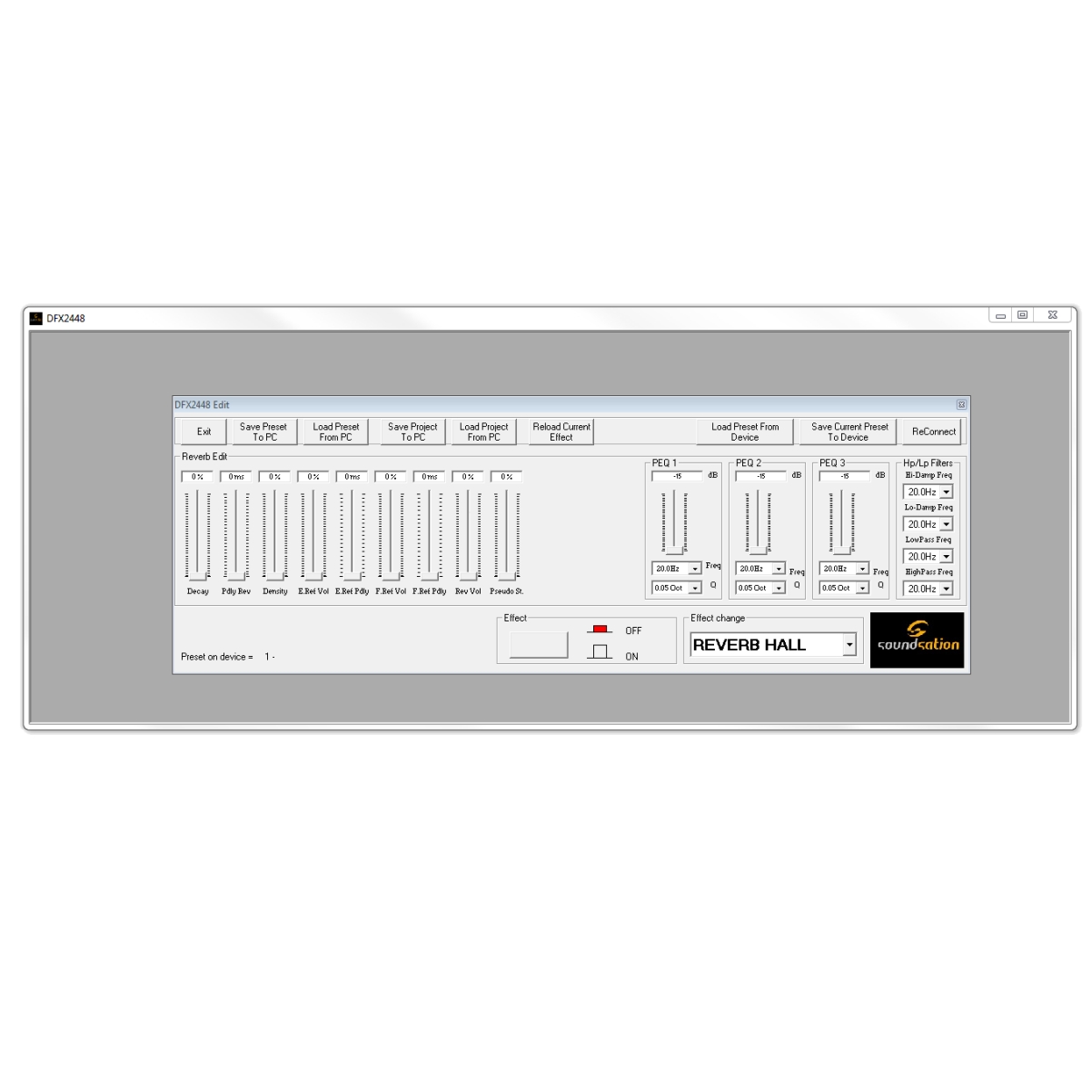 - A DFX-2448 egy digitális effekt processzor, 1 hüvelykes rackmount 1U házba csomagolva. A felhasználói felületet gondosan úgy alakították ki, hogy felhasználóbarát legyen, és egy központi forgó vezérlőből áll navigációs célokra, egy potenciométerből a paraméterek beállításához, valamint három további potenciométerből az INPUT, OUTPUT és MIX szintek vezérléséhez. A DFX-2448 2 x 20 LCD alfanumerikus kijelzővel rendelkezik a könnyű hozzáférés és beállítás érdekében, valamint a LED kijelzés a CLIP, MUTE és az a TAP idő LED-en. Az egység csatlakoztatható MIDI-en és USB-n keresztül a külső vezérléshez és az adatok kétirányú mozgatásához. A BYPASS effektusok lábpedál vezérléséhez és a TAP DELAY külső beállításához hátsó jack csatlakozók is vannak. A TAP DELAY az előlapi kapcsolóval is változtatható. A 16 előre beállított érték közvetlenül módosítható az egység panelen vagy a mellékelt PC Software Manager segítségével.
