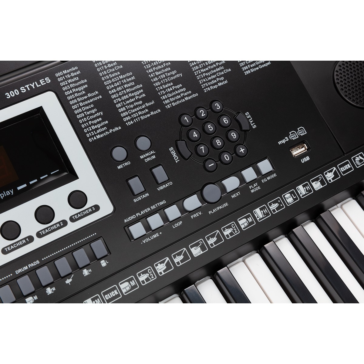 - Fő funkciók: Sustain, Vibrato, Transpose, Tempo, Metronóm, Kézi dob, Intelligens tanítás