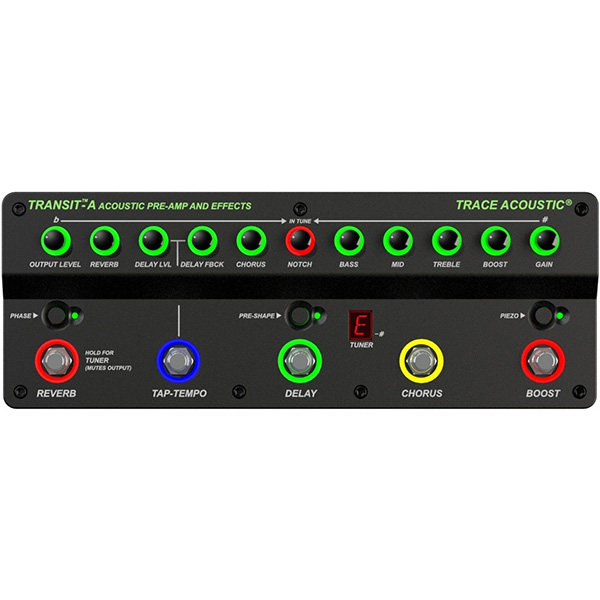 A Transit ™ A előerősítő pedál valamennyi olyan funkciót tartalmaz amely a professzionális akusztikus gitárjátékhoz nélkülözhetetlen, anélkül hogy ez túlzott terhet róna a felhasználóra a sok felesleges plusz kezelőszerv miatt. Ezek általában csak akadályozzák a gitárost gyors és egyszerű váltásokban. A beépített kompresszor, a Notch Filter, a Pre-shape és az egyszerű hangszínszabályzók biztosítják a nagyszerű alap AC hangot, míg a felhasználó által választható Boost, Chorus, Delay és Reverb a művészi kifejezéshez szükséges összes eszközt felkínálja. A háttérvilágítású vezérlőpanel kromatikus tunerré válik a hangszer hangolásakor. A beépített szimmetrikus Pre és Post XLR kimenet, egy normál sztereo kimenet, egy „DRY” kimenet és a fejhallgató kimenet közül választhat a felhasználó a számára leginkább megfelelő hangzás érdekében.