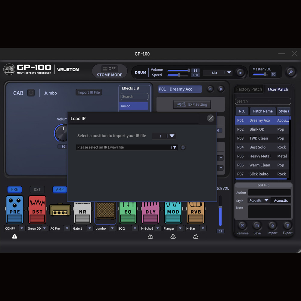 A GP-100-ban megtalálható a HD digitális modellező rendszerünk, amely organikus élő hangzást és több, mint 140 választható effektet biztosít, köztük 45 legendás gitár / basszusgitár / akusztikus erősítő szimulációkat, 40 gyári hangláda IR-t és 198 presetet (99 felhasználói és 99 gyári).